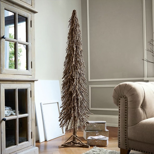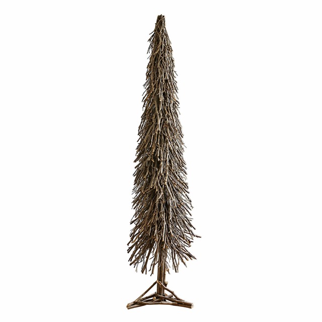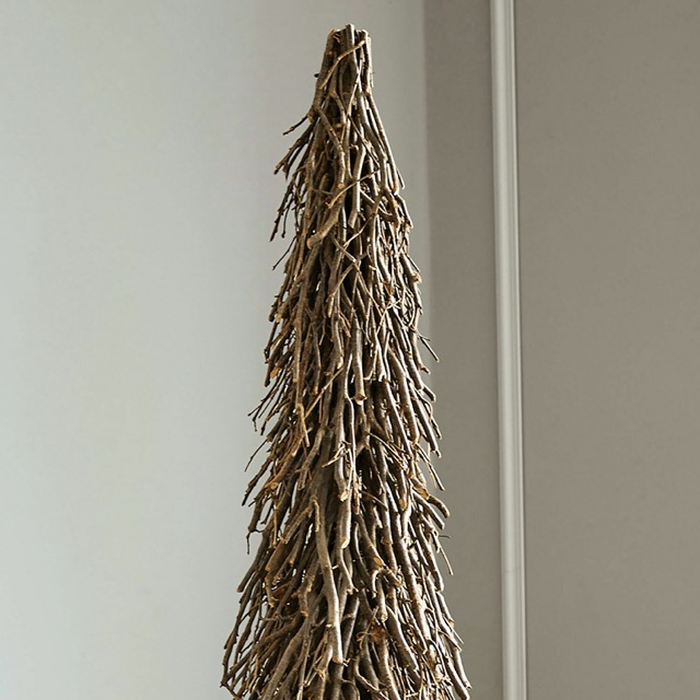 Ohne die typische Tannenform, mit den ausladenden Ästen, hat der Künstler den Deko-Baum schön schmal bis in eine stattliche Höhe von 160 cm wachsen lassen. Auch hat er ihm gleich einen stabilen Fuß, ebenfalls aus Haselnusszweigen, gegeben, der die gute Standfestigkeit garantiert.