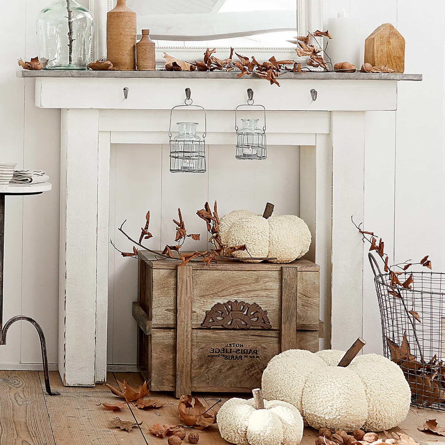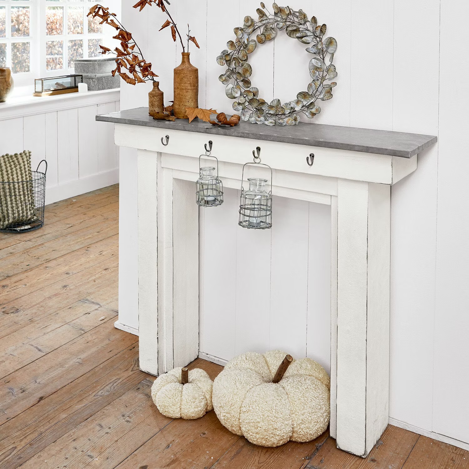Außerdem warten an der Stirnseite der “KAMINKONSOLE LESTERBY antikweiß #18524-w” bereits stabile Haken darauf, dass Sie Lichterketten, Tannenzweige oder hübsche Figuren daran hängen.