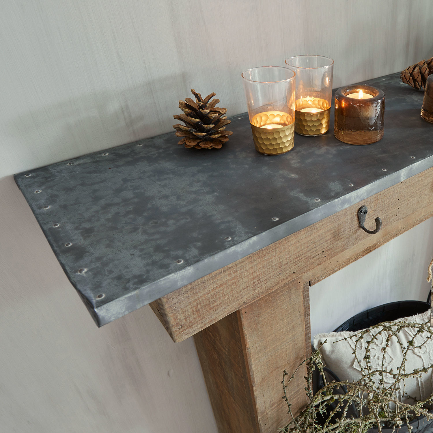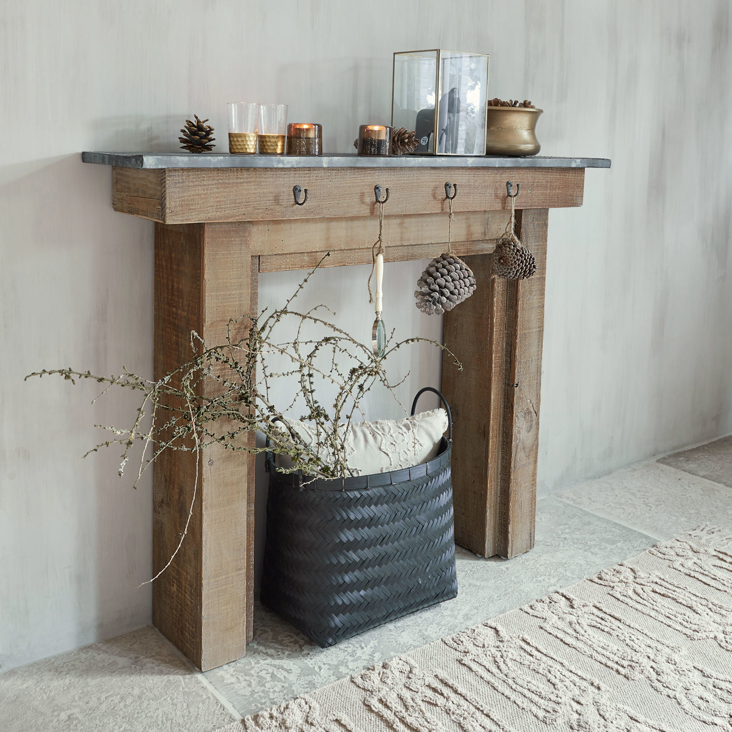 Der raue Charme der Holzelemente wird perfekt ergänzt von der Platte aus massivem Eisen, die den oberen Teil der Kaminumrandung bildet. Gerne werden solche Kaminkonsolen in der kalten Jahreszeit zum Mittelpunkt stimmungsvoller Deko-Ideen – von großen Stumpenkerzen im Inneren bis zu jahreszeitlicher Deko oben auf der Konsole.