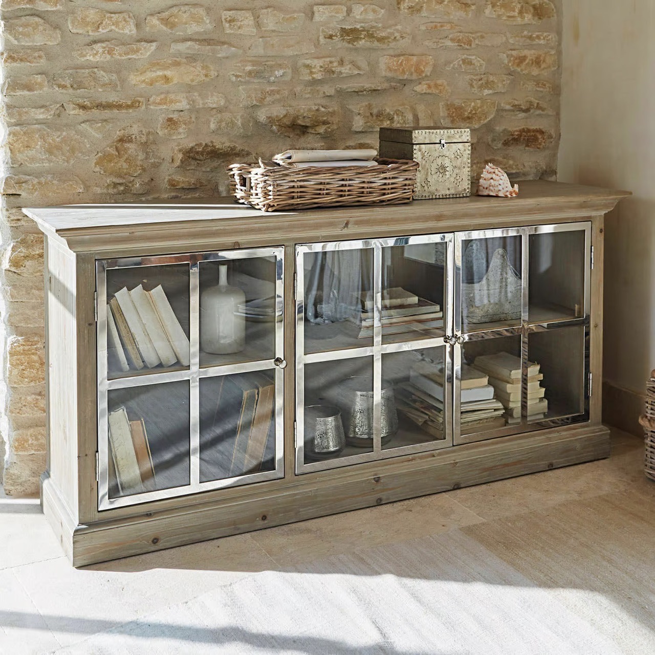 Dieses „Sideboard Keyport Tannenholz/Glas/Edelstahl Antik-Finish“ ist ein exklusives Unikat, jedoch bringt es Ablage und Stauraum ins Wohnzimmer und fügt sich hervorragend in den klassischen Landhaus-Stil ein.