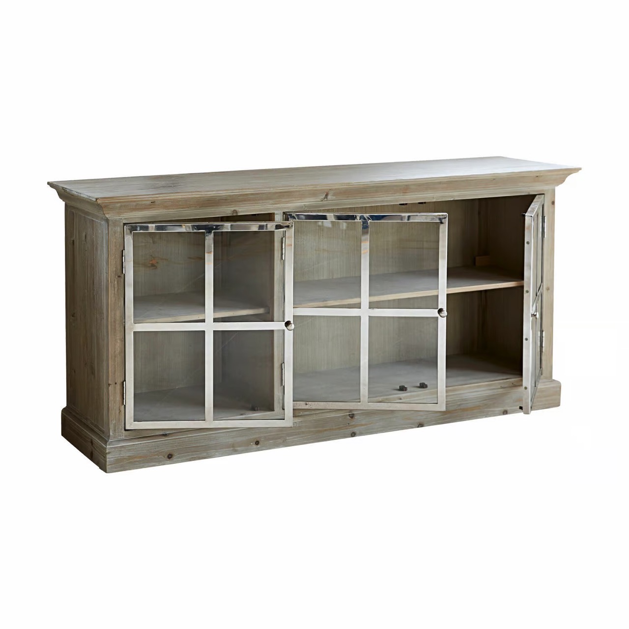 Dieses exquisite „Sideboard Keyport Tannenholz/Glas/Edelstahl Antik-Finish“ ist das beste Beispiel, wenn Möbeldesigner zeitlose Klassiker zu neuen Wohn-Highlights aufleben lassen!