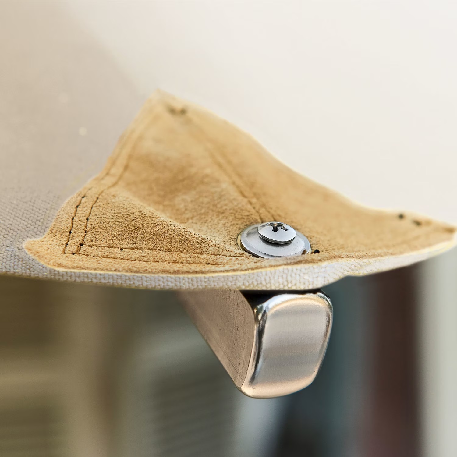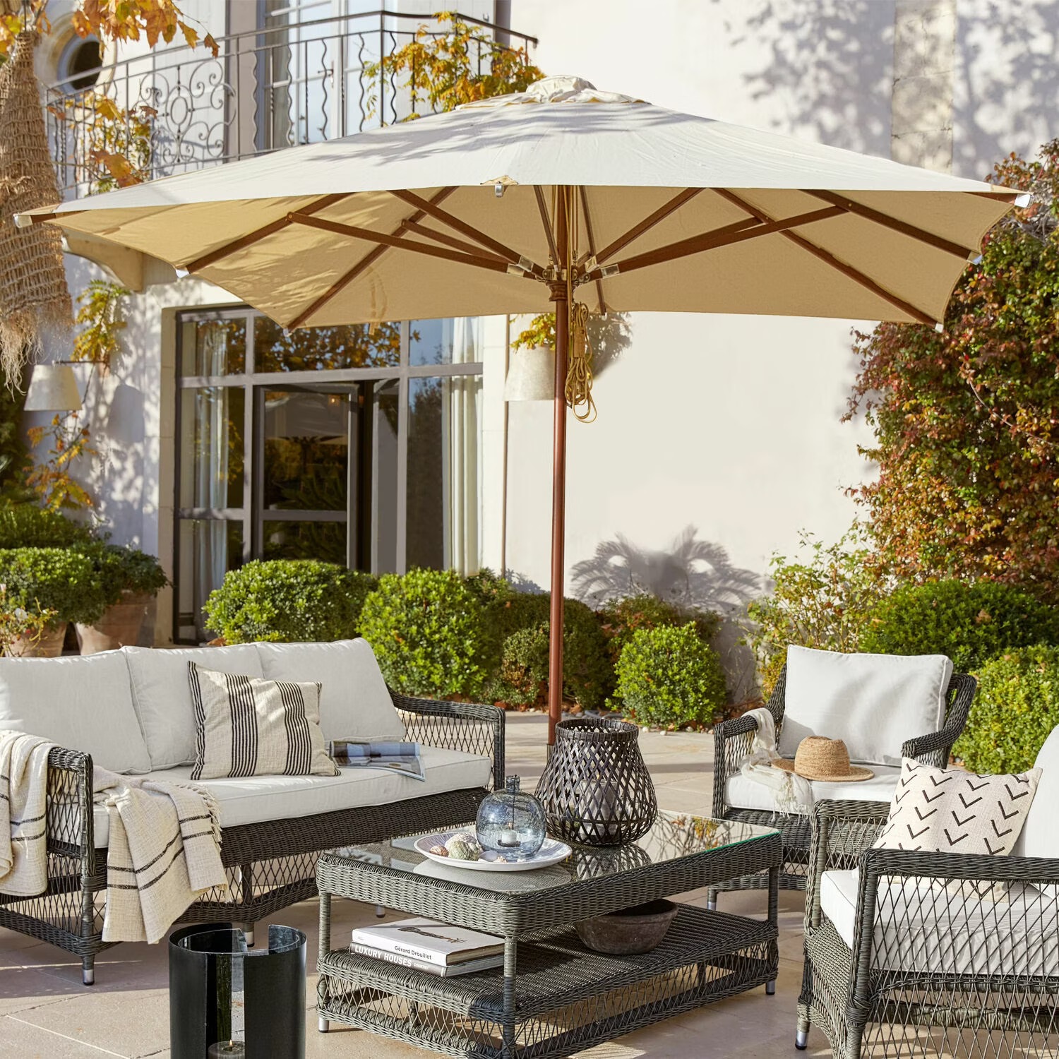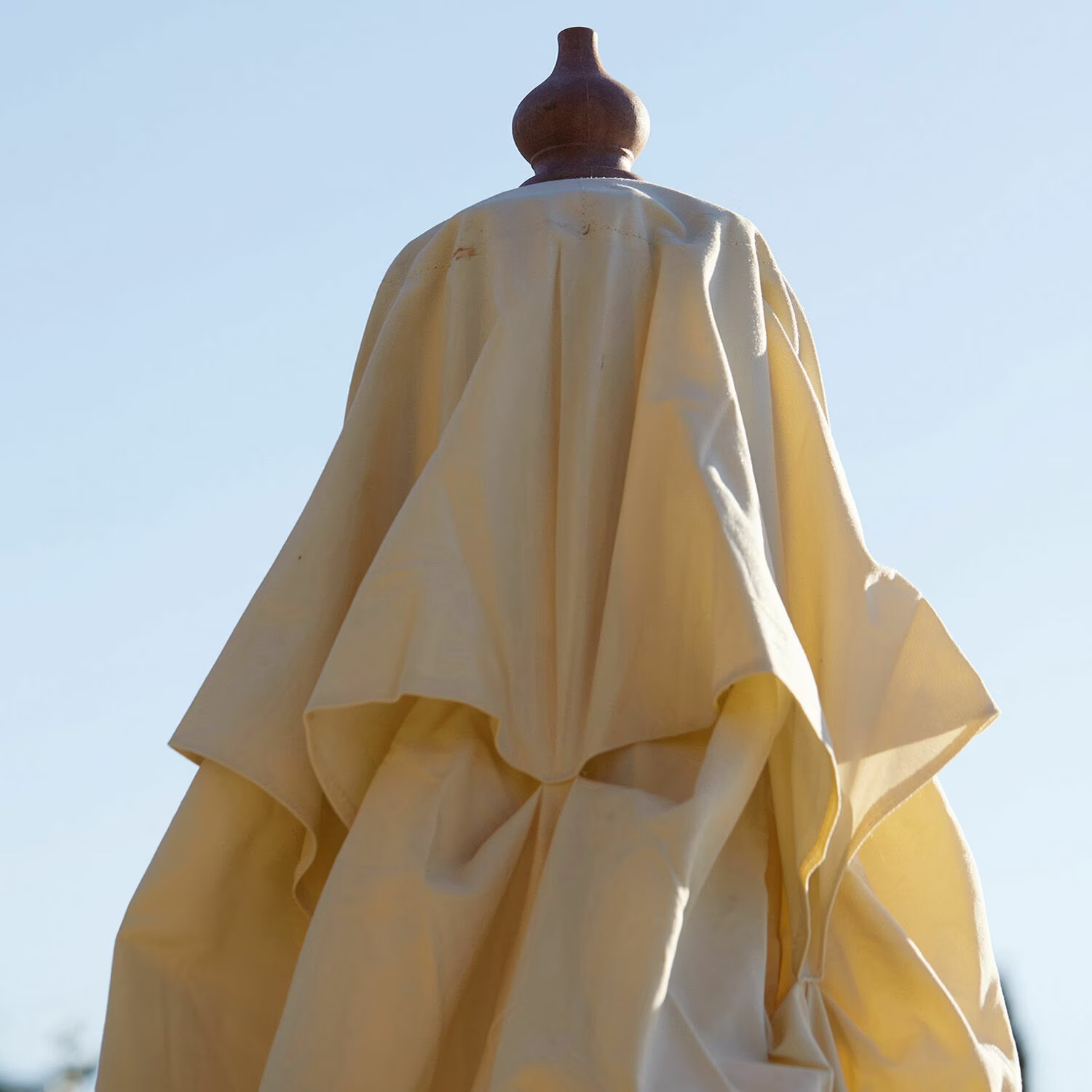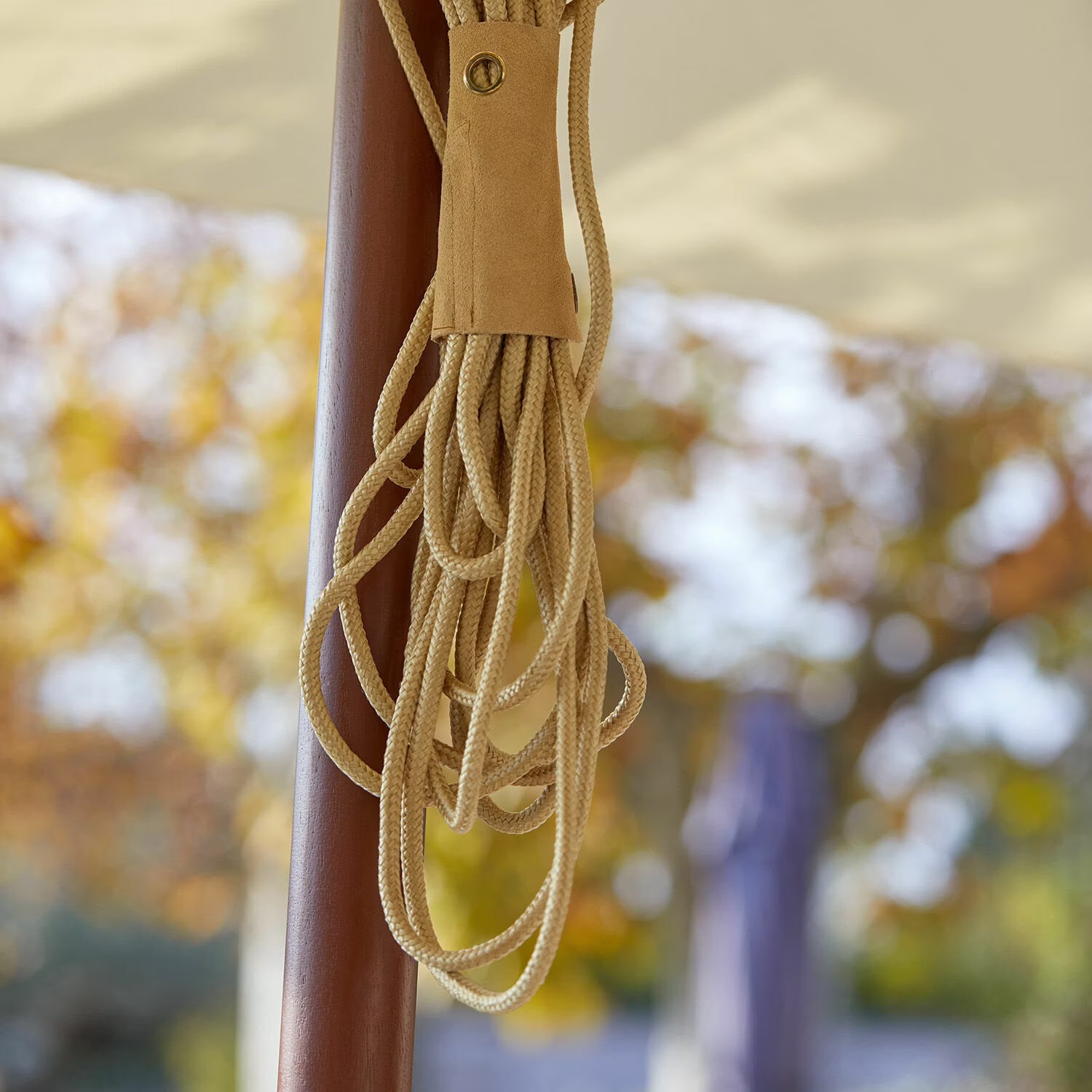 Durch den doppelten Flaschenzug ist der “Sonnenschirm Barnet quadratisch #10647” bequem zu öffnen und zu schließen. Wenn er aufgespannt ist, können Sie das Seil in einem kleinen Ledermäppchen (wird mitgeliefert) verschwinden lassen.