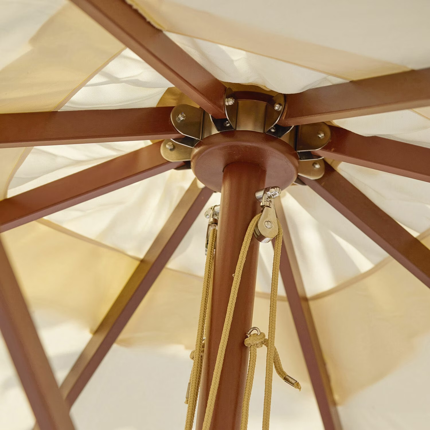 Das Gestänge ist aus Eukalyptus-Holz gearbeitet und die Schirmstreben stecken in stabilen Metallhülsen. Seine Bespannung aus robustem Olefin, dadurch hält er auch mal einem Regenschauer Stand.
