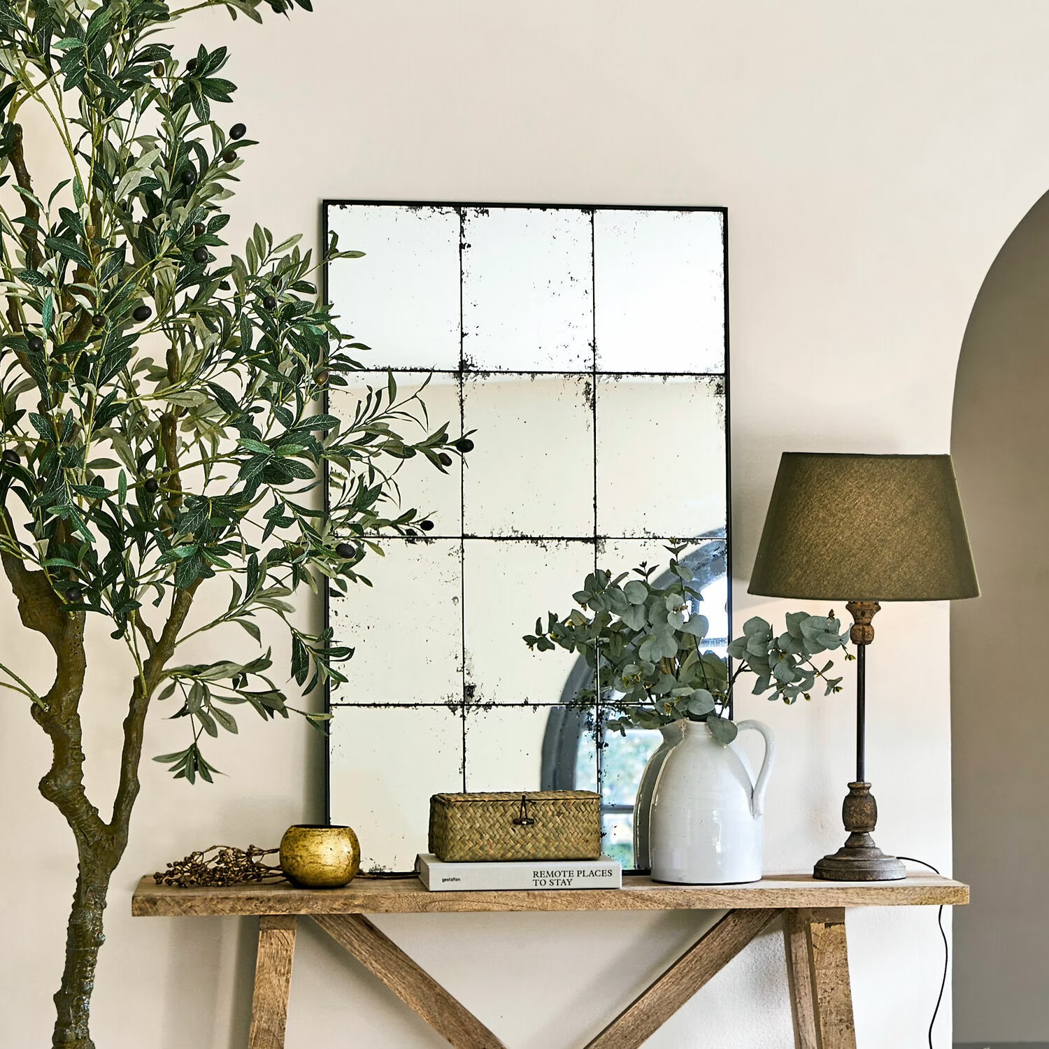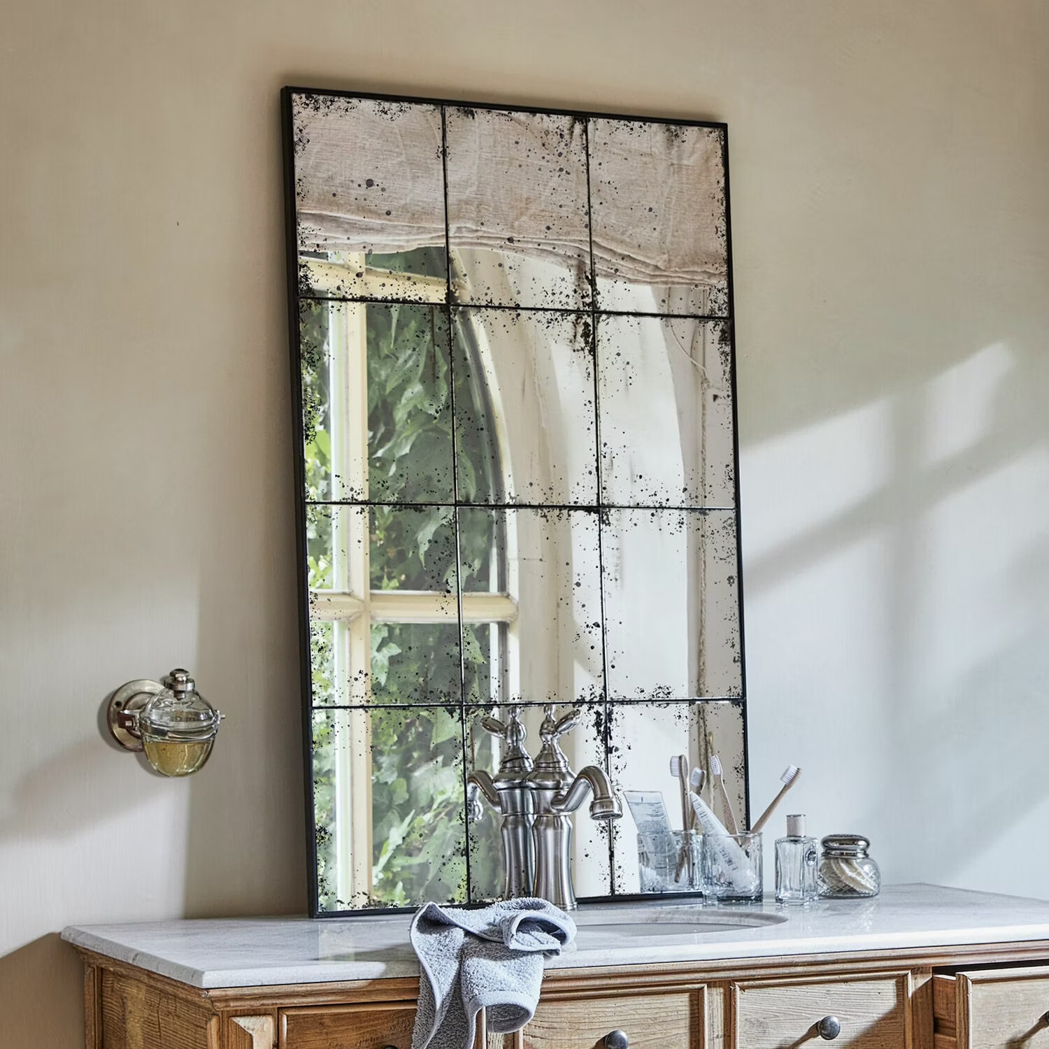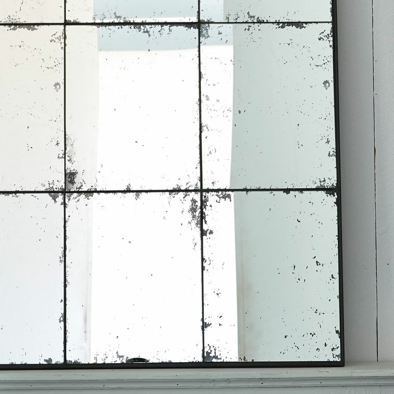 Sein Eisenrahmen ist zurückhaltend designt, da er relativ dünn ist. Dafür bilden die aneinander gesetzten Spiegelflächen die bezaubernde Sprossenfenster-Optik, die durch das Antik-Finish noch deutlicher zum Vorschein kommt.