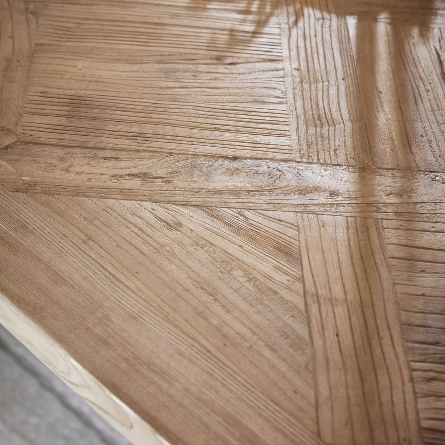 Die Oberfläche des Holzes ist gewachst und schützt so das wertvolle Material. Damit wird die Schönheit und der Anblick des “Tisch QUILLANCOURT Ulmenholz Intarsienmuster” über Jahre hinweg bewahrt.