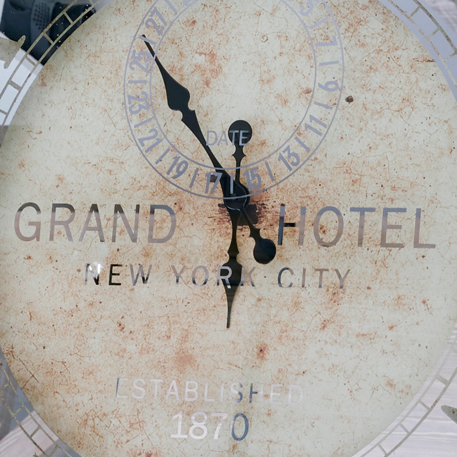Die Wanduhr “Uhr – MIRADS – Eisen-Glas – Antik-Finish – #18400” kann offensichtlich auf ein langes Vorleben zurückblicken. Wie mag wohl das Tagesgeschäft dieser eleganten Uhr ausgesehen haben? Zierte sie vielleicht die Wand hinter der Rezeption im Grand Hotel von New York? So lässt es zumindest der Schriftzug vermuten. Durfte sie dort tagein und tagaus den elegant und nach der neuesten Mode gekleideten Gästen die Zeit anzeigen?